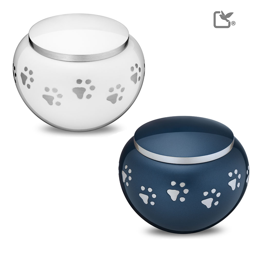 High quality Classic round paw print ashes urn. These beautiful high quality urns features pawprints around the urn rather than on the lid, finished in a glosscoat finish and are available in 3 sizes in either Blue or White with Pewter Paw Print.