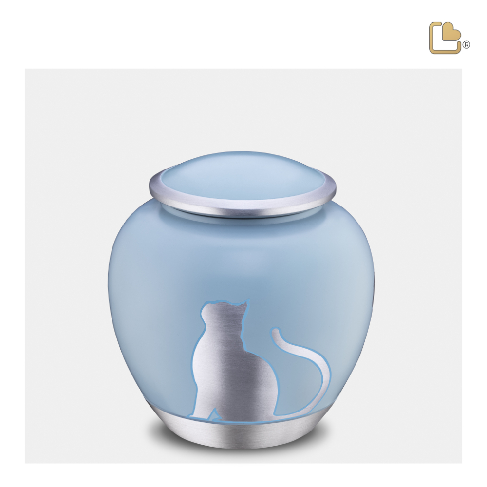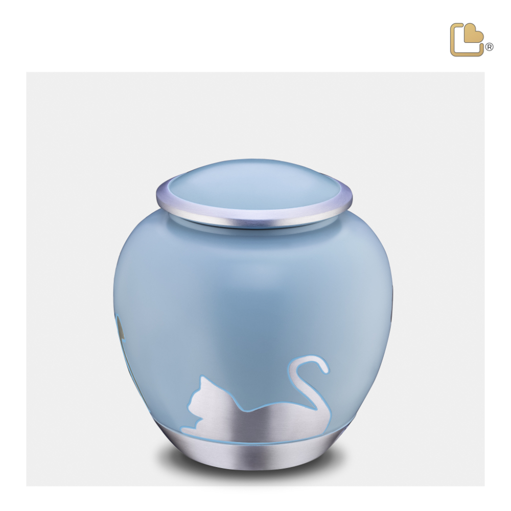 High quality serenity cat ashes urn. This beautiful high quality discreet urn features different images of a cat sitting, lying down & looking up, finished in a softcoat finish and is available in Pink for Girls and Blue for Boys.